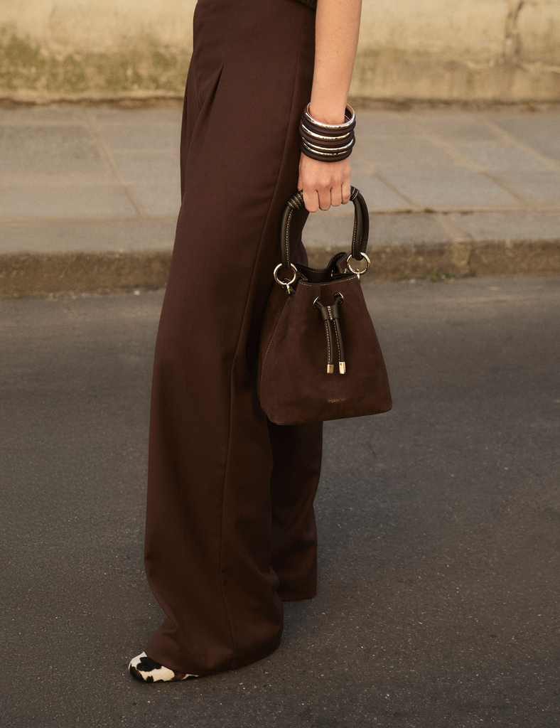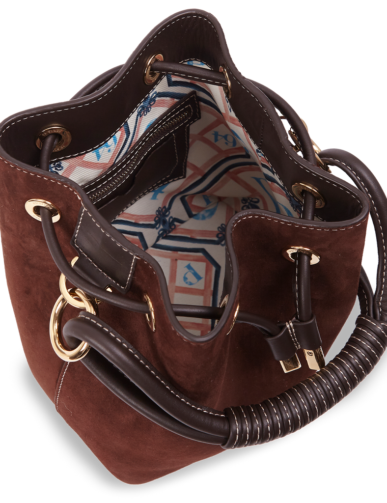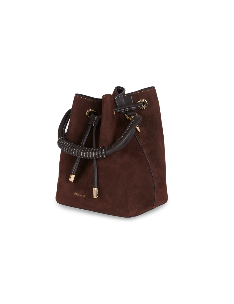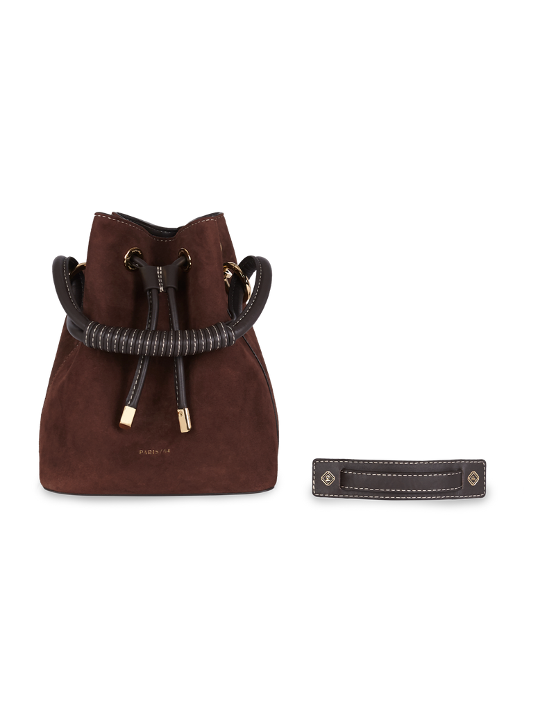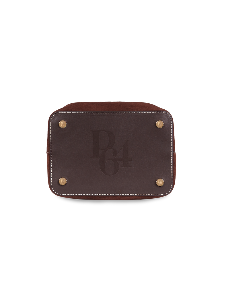 Bolso bombonera en ante marrón cacao con cierre de cordón y asa larga de piel, para llevarlo como bandolera o de mano. Confeccionado artesanalmente con piel de alta calidad, lo que le otorga un aspecto sofisticado y máxima durabilidad.