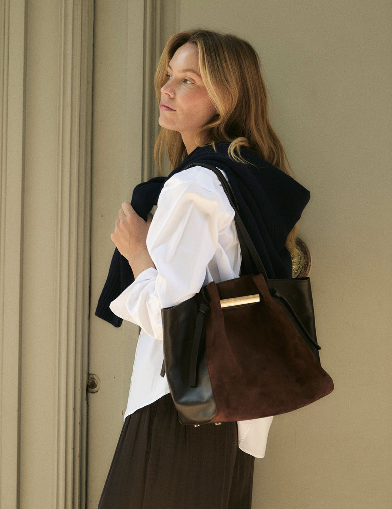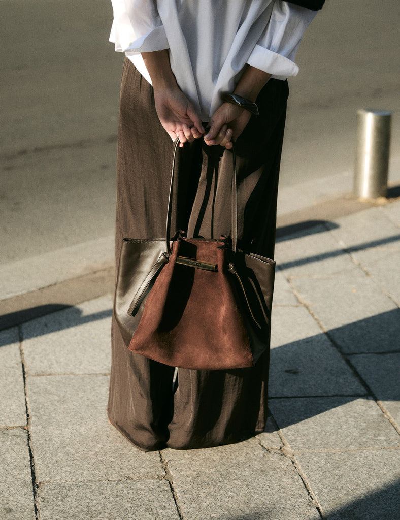 Mini Lumière es la versión mini de la familia Lumière, un icono de la firma en piel y ante negro. Diseño atemporal de líneas limpias con acabados y piel de alta calidad.