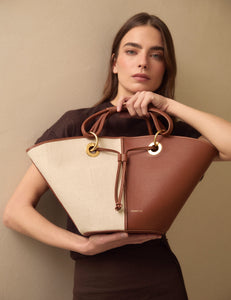 Bolso en piel de origen vacuno marrón chocolate y fibras naturales (rafia y lino) con cierre de cordón e imán y asa larga de piel, para llevarlo como bandolera o de mano.