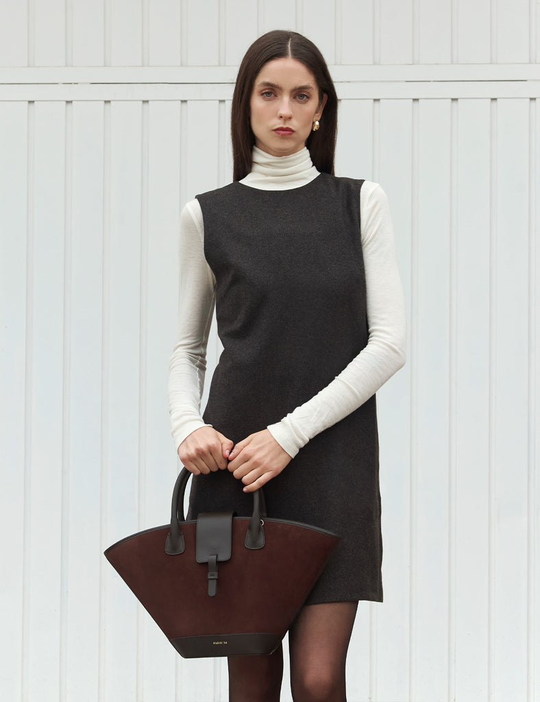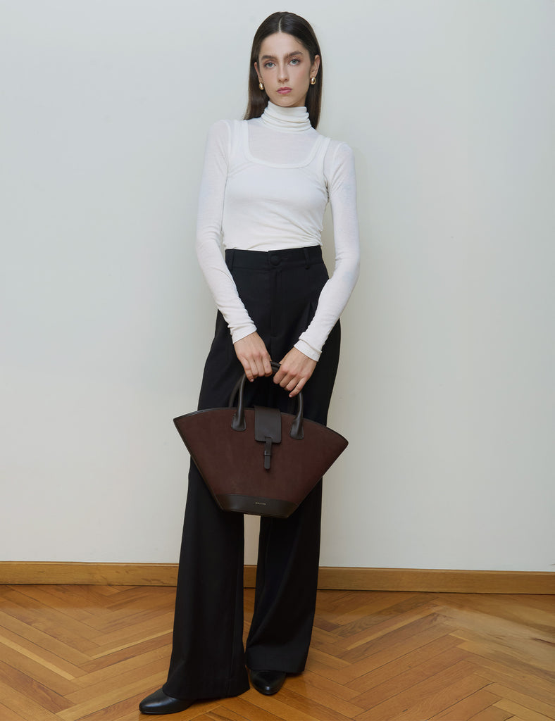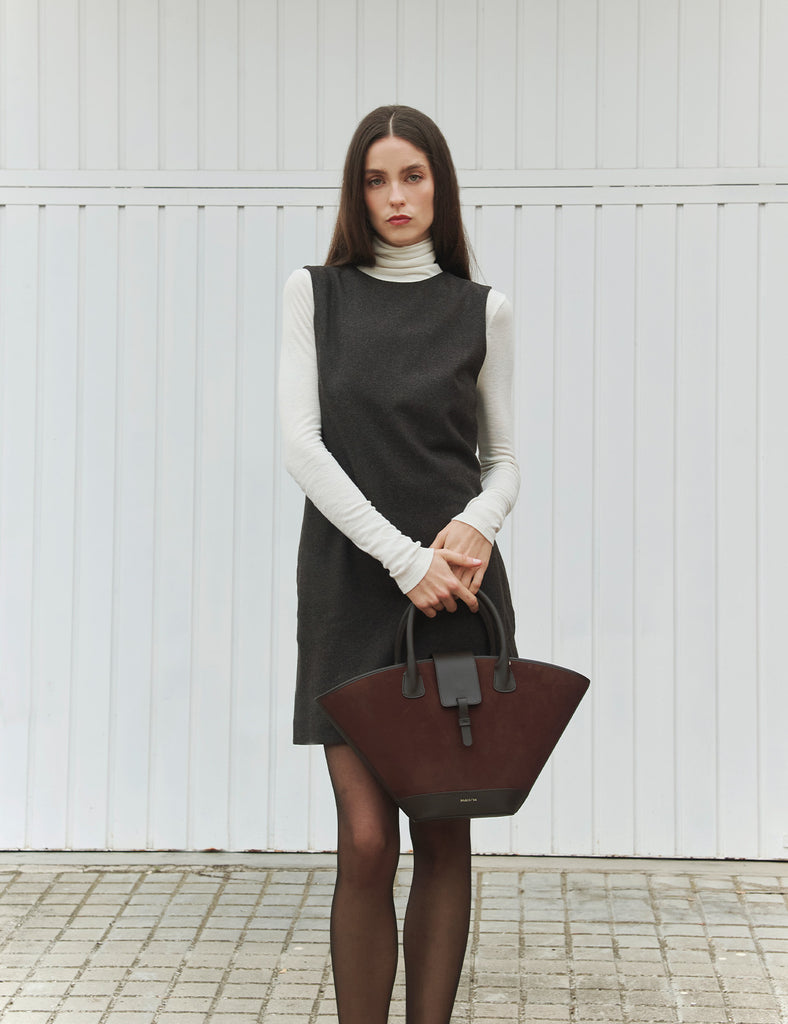 Icono de la firma en piel y ante marrón cacao. Diseño atemporal de líneas limpias con acabados y piel de alta calidad.