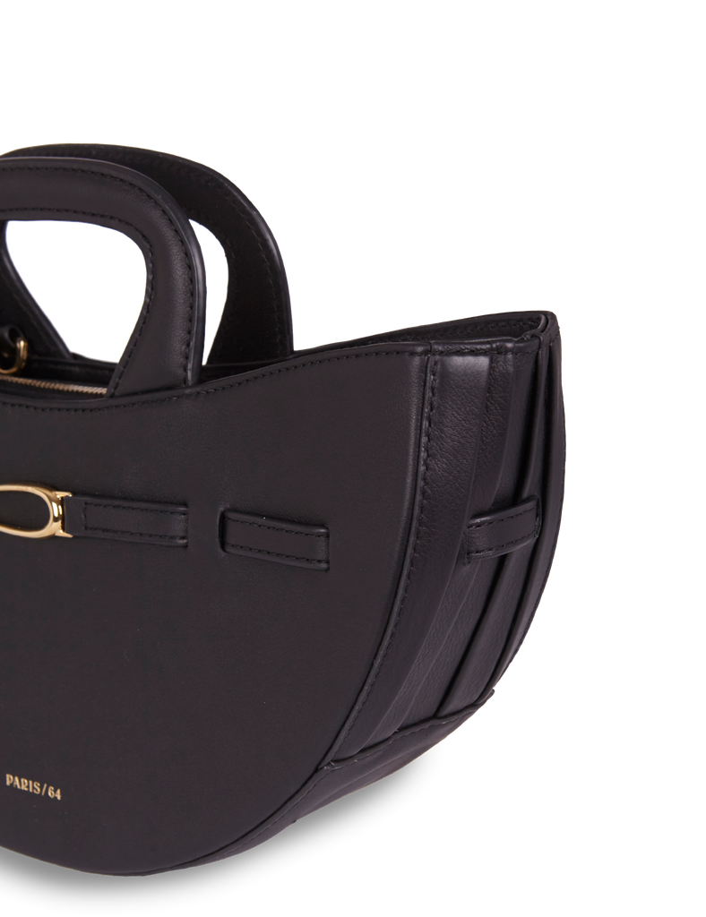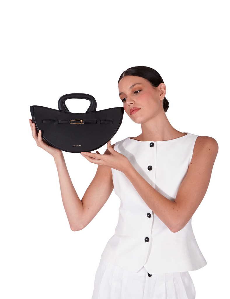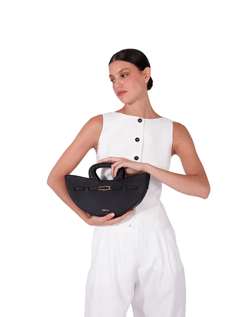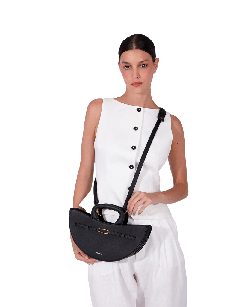 Con su distintiva silueta semicircular, este diseño minimalista en piel combina funcionalidad y sofisticación en partes iguales. El detalle metálico en dorado aporta un toque sutil de luz, mientras que el interior amplio y estructurado lo convierte en el compañero perfecto tanto para el día como para la noche.