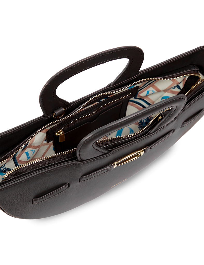La versión mini del bolso Galope conserva toda la elegancia de su silueta original, en un formato más ligero y versátil. Con asas acolchadas para un agarre cómodo y delicado, y una correa ajustable que permite llevarlo como bandolera.