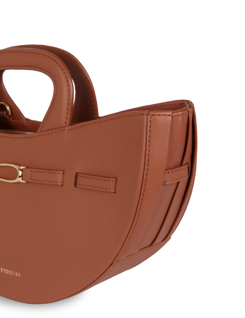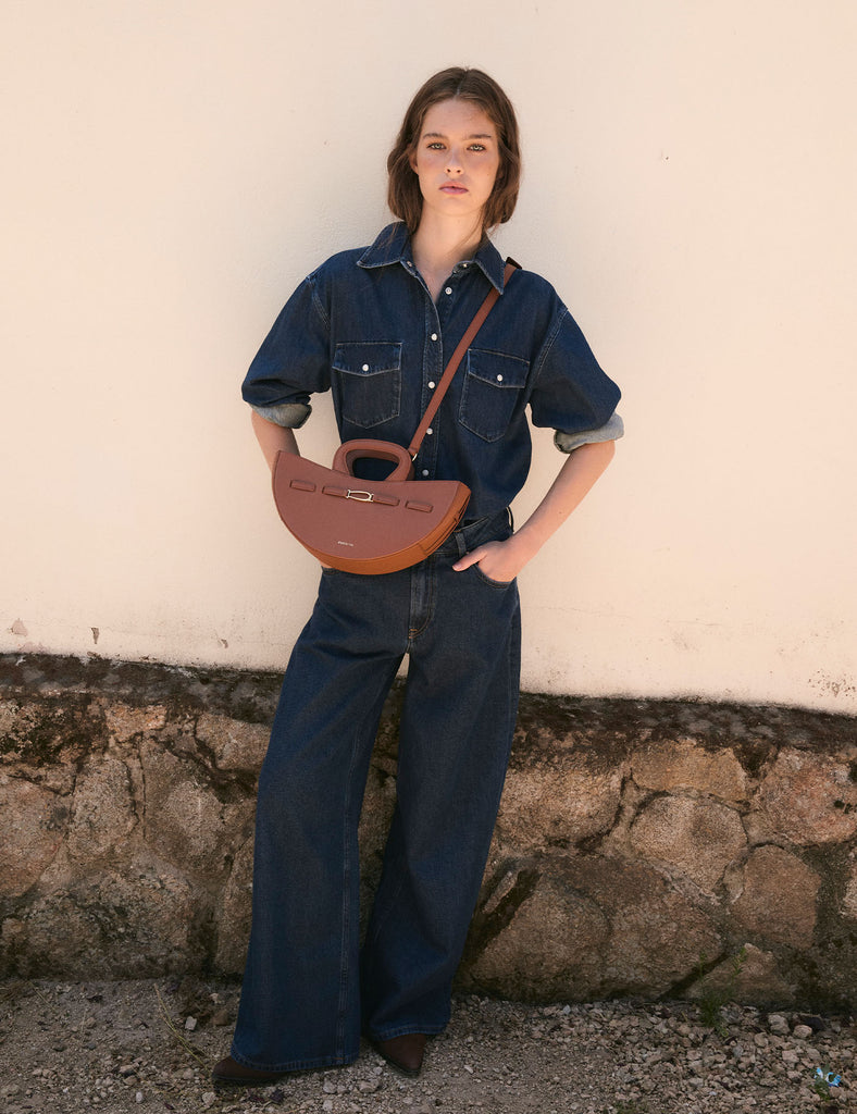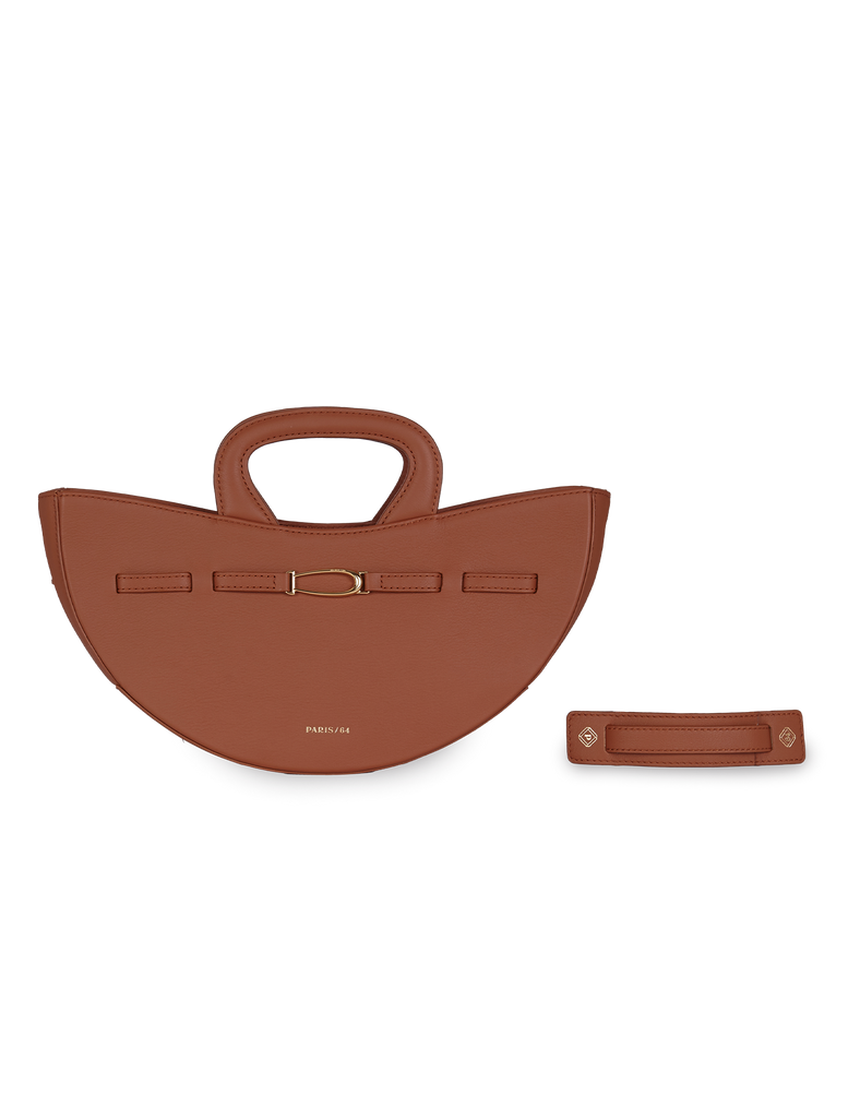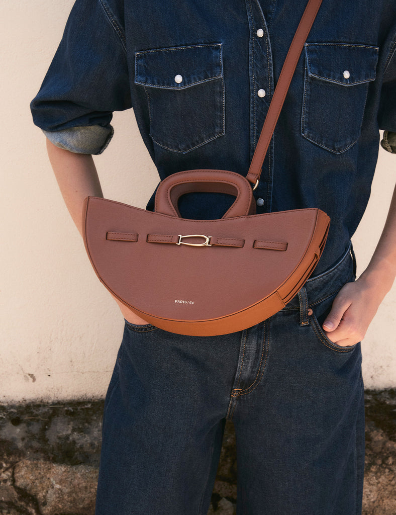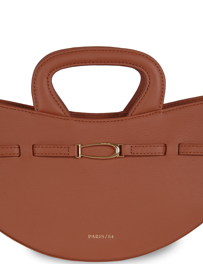 Con su distintiva silueta semicircular, este diseño minimalista en piel combina funcionalidad y sofisticación en partes iguales. El detalle metálico en dorado aporta un toque sutil de luz, mientras que el interior amplio y estructurado lo convierte en el compañero perfecto tanto para el día como para la noche.