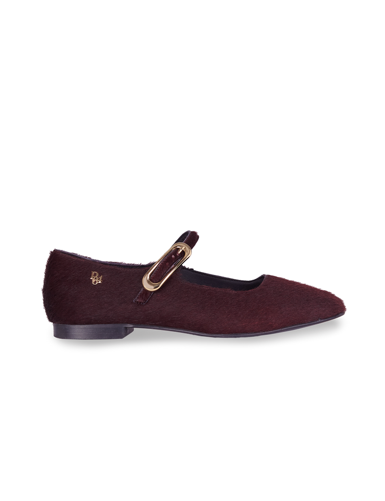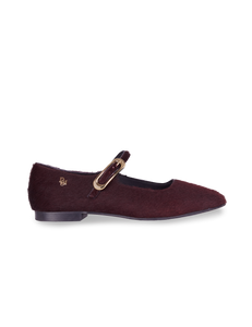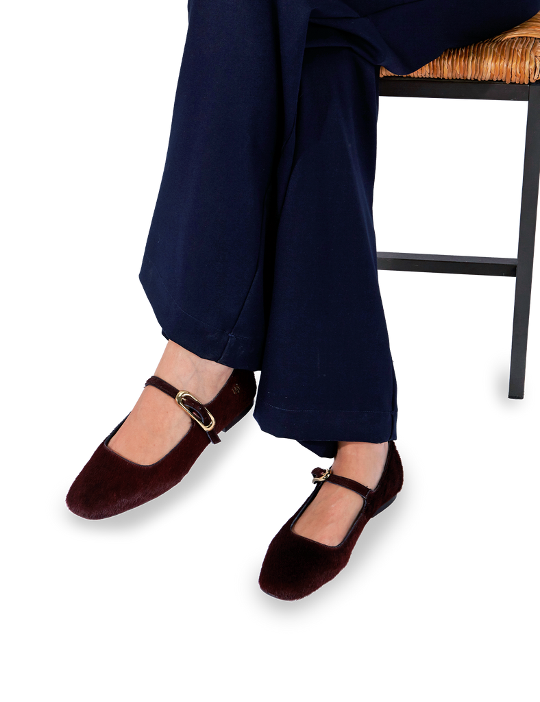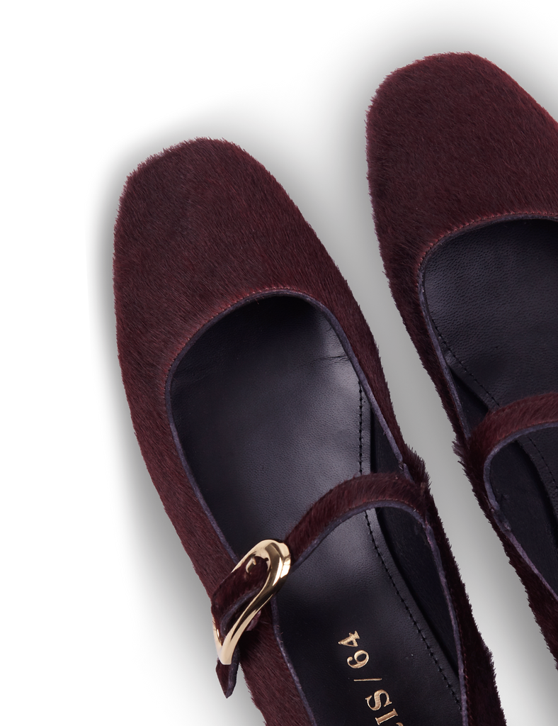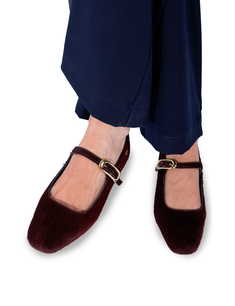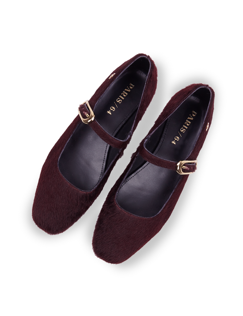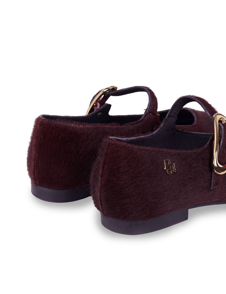 Bailarinas tipo Mary Jane en pelo de potro burdeos fabricada artesanalmente en España, con cierre de hebilla en la tira del empeine y monograma P64 en dorado en el lateral.