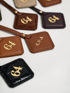 Our Monogramming is a leather name tag that can be purchased separately as an accessory to hang on your bag and engrave your initials. On one side, the logo 64 is engraved and on the other side, the initials in gold. You can choose 3 letters with punctuation marks or without punctuation marks.