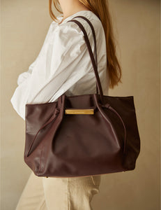 Burgundy shopper bag made of very soft and high quality cowhide leather. Lightweight and large capacity. Its modern yet timeless silhouette, luxury gold buckle and finish, as well as the texture and softness of the leather, make it the perfect day bag. Secure closure with a central magnet.