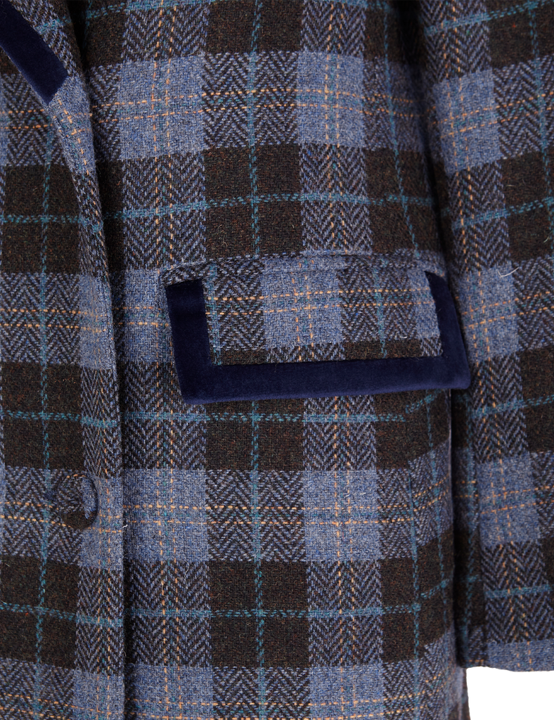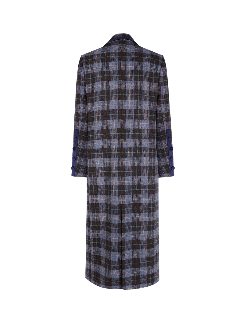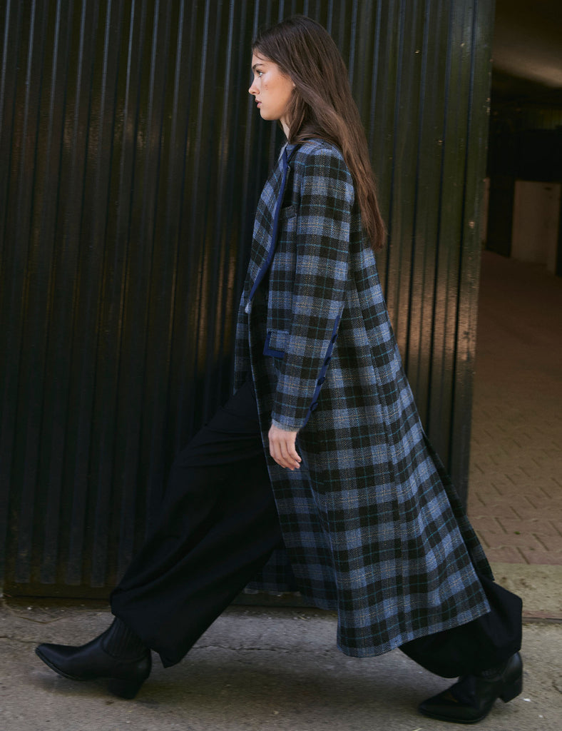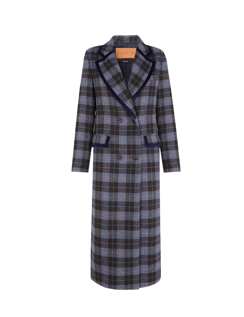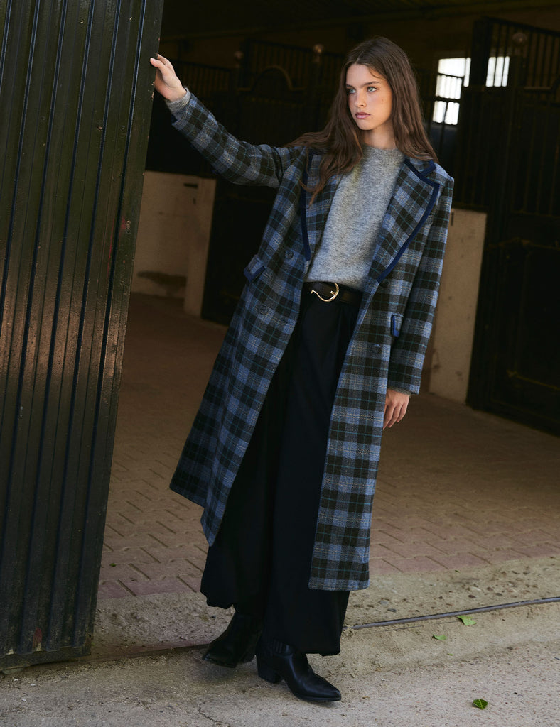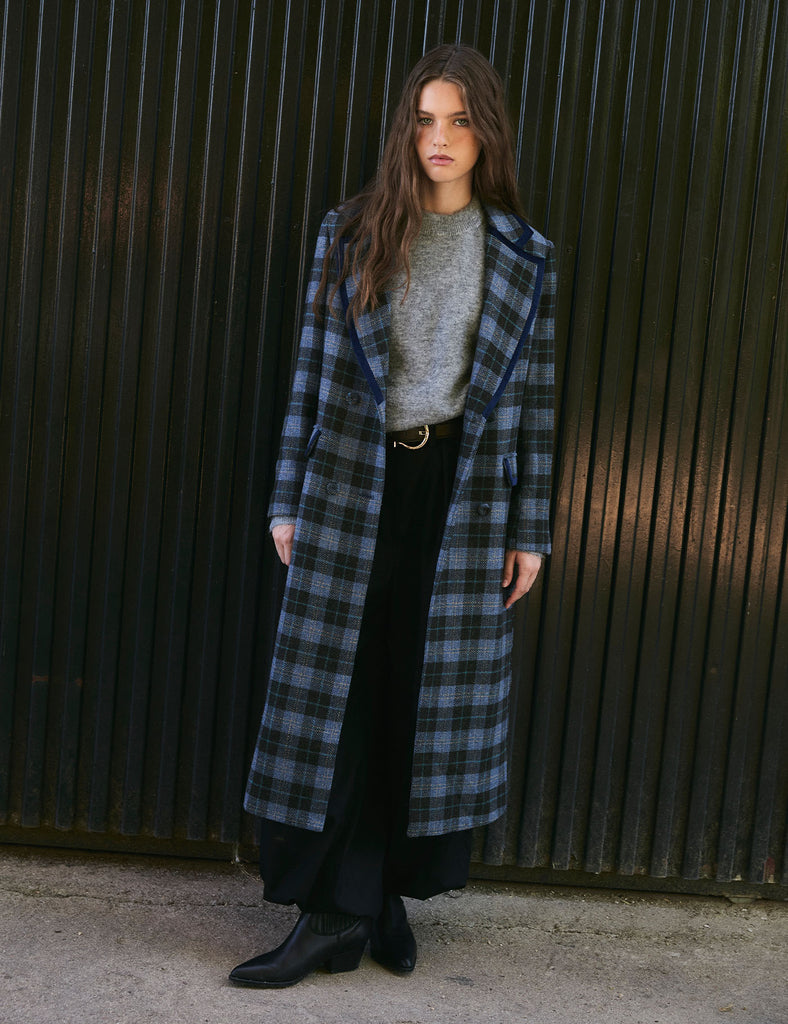 Maxi coat with a straight cut and length, made of 100% wool, featuring contrasting navy velvet details on the lapels and pocket trims.