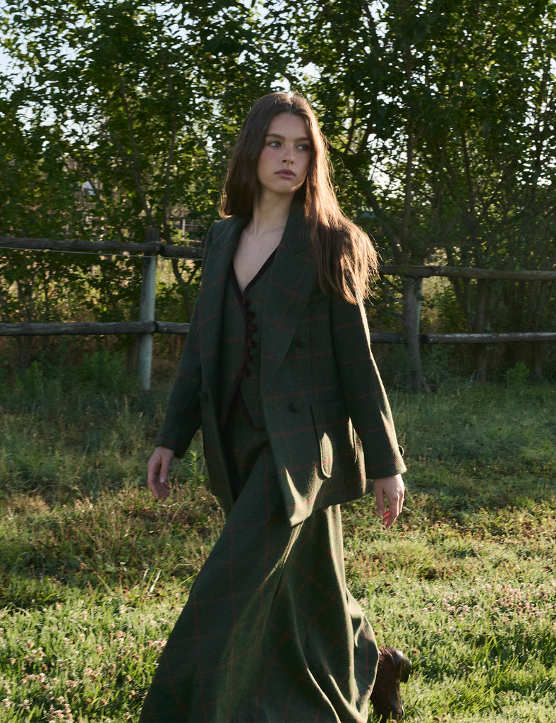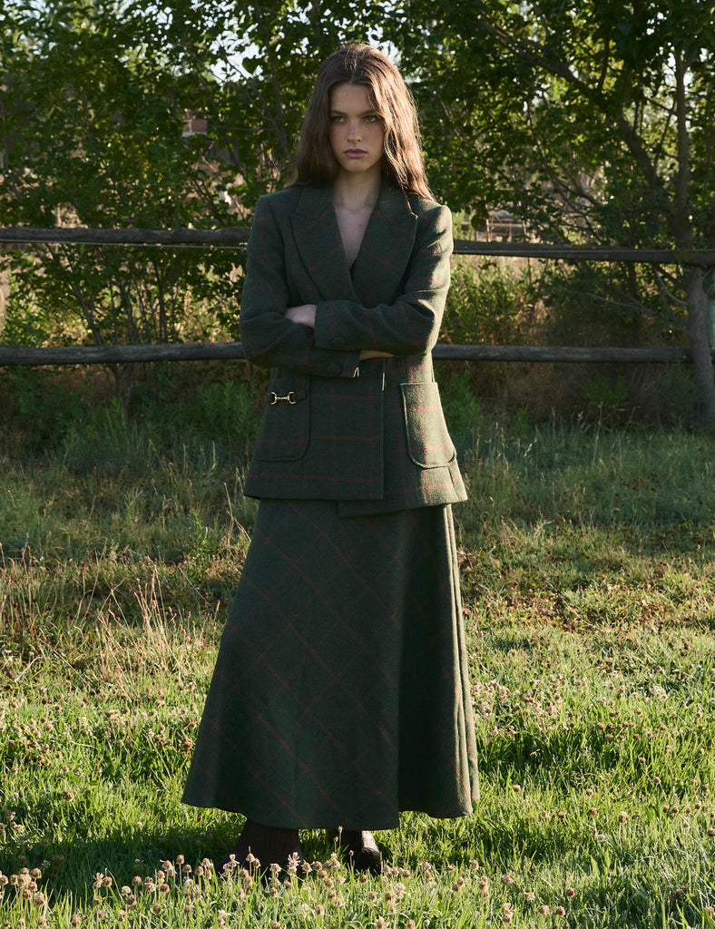 Introducing our Diana blazer, an exemplary piece of English style featuring contrasting leather buttons. This classic straight-check blazer is crafted from 100% wool and adorned with double leather buttons, flap pockets, and gold metal hardware details.