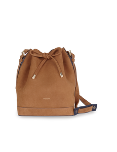Bolso saco de ante y piel de color marrón de forma estructurada y acabado ultra suave al tacto.