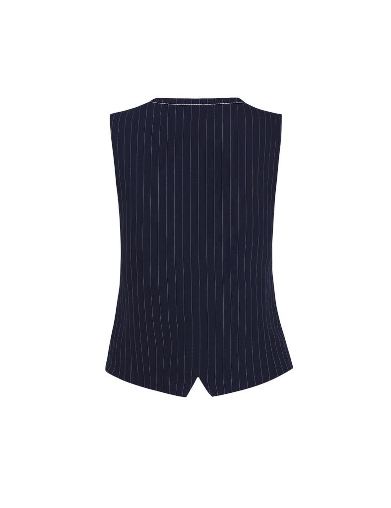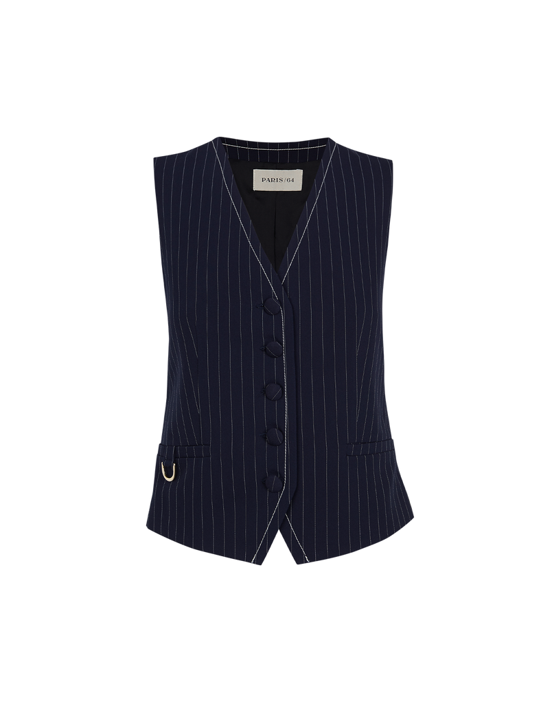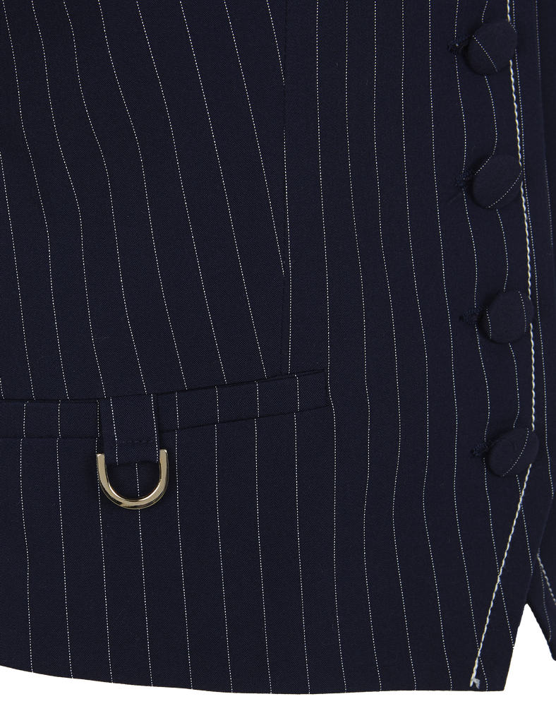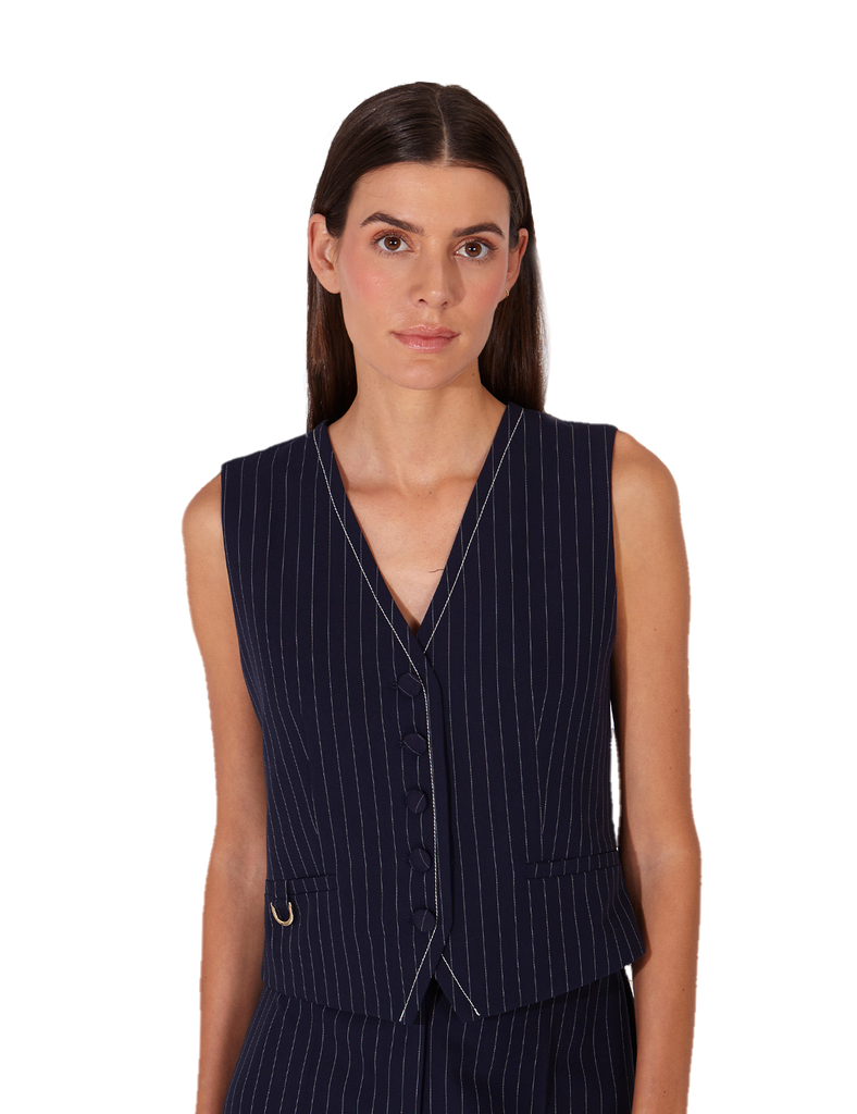 Chaleco sastre entallado de raya diplomática. Escote en pico y cierre frontal enmarcado por pespuntes a contraste en tono off white y botones forrados. Bolsillos de vivo delanteros ribeteados, con un detalle de herraje metálico plateado. Una pieza destacable por sus detalles cuidadosamente diseñados que añaden un toque de exclusividad y estilo a cualquier look.