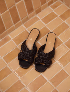 非常に柔らかな編み込みレザーを使用したブラックサンダル。スペインでハンドメイドされています。