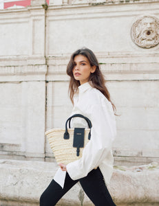 손으로 엮은 팜 소재에 블랙 소가죽 디테일을 더한 대용량 바스켓 백. PARIS/64 안감의 이너 파우치와 드로스트링 여밈이 특징입니다.