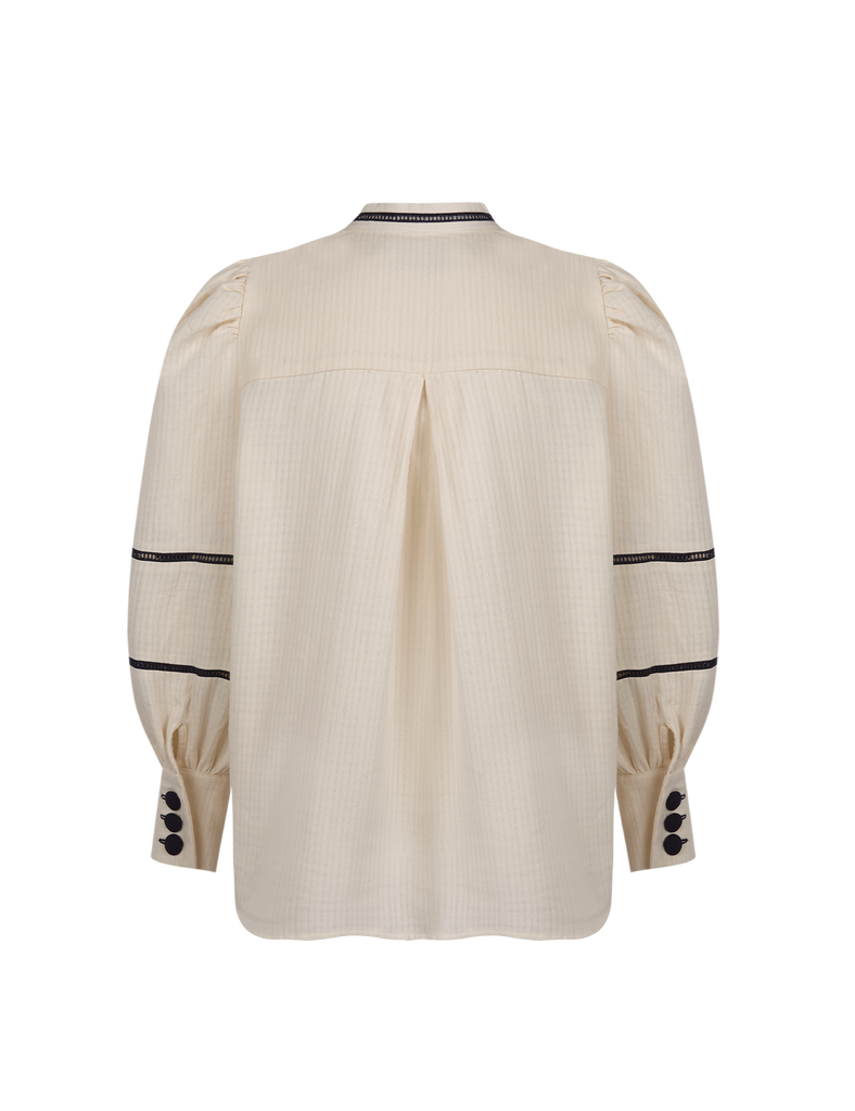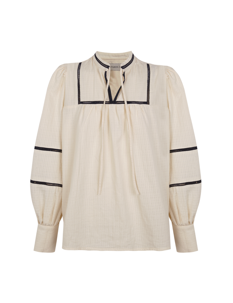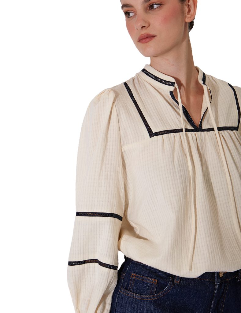 Blusa de silueta holgada 100% algodón en color beige con entredós azul marino a contraste. Escote con abertura y lazada, que permite llevarla tanto abierta como cerrada. Mangas con frunces en hombros, juego de entredós, y puño alto con botones a contraste.