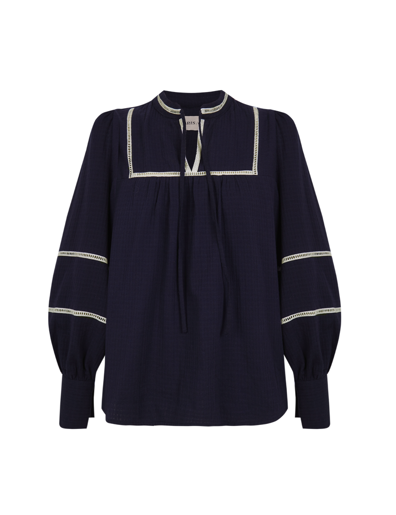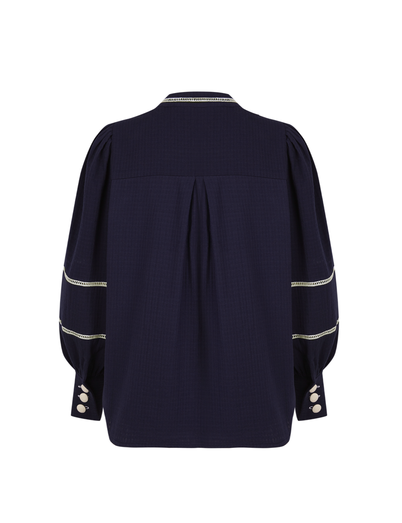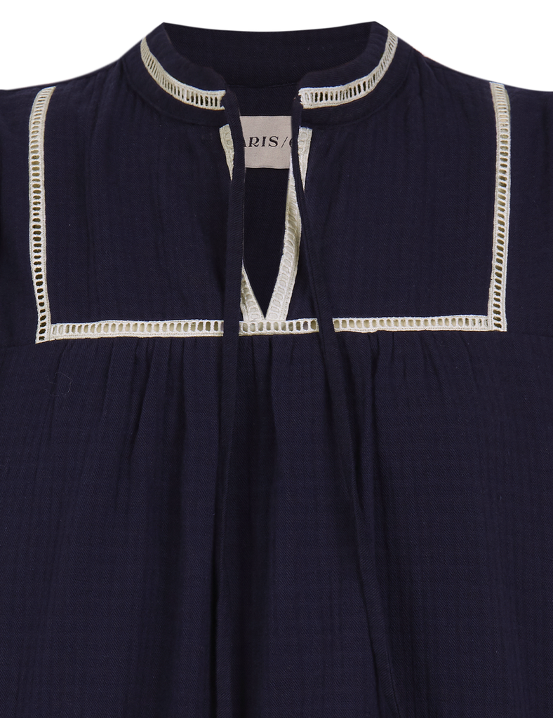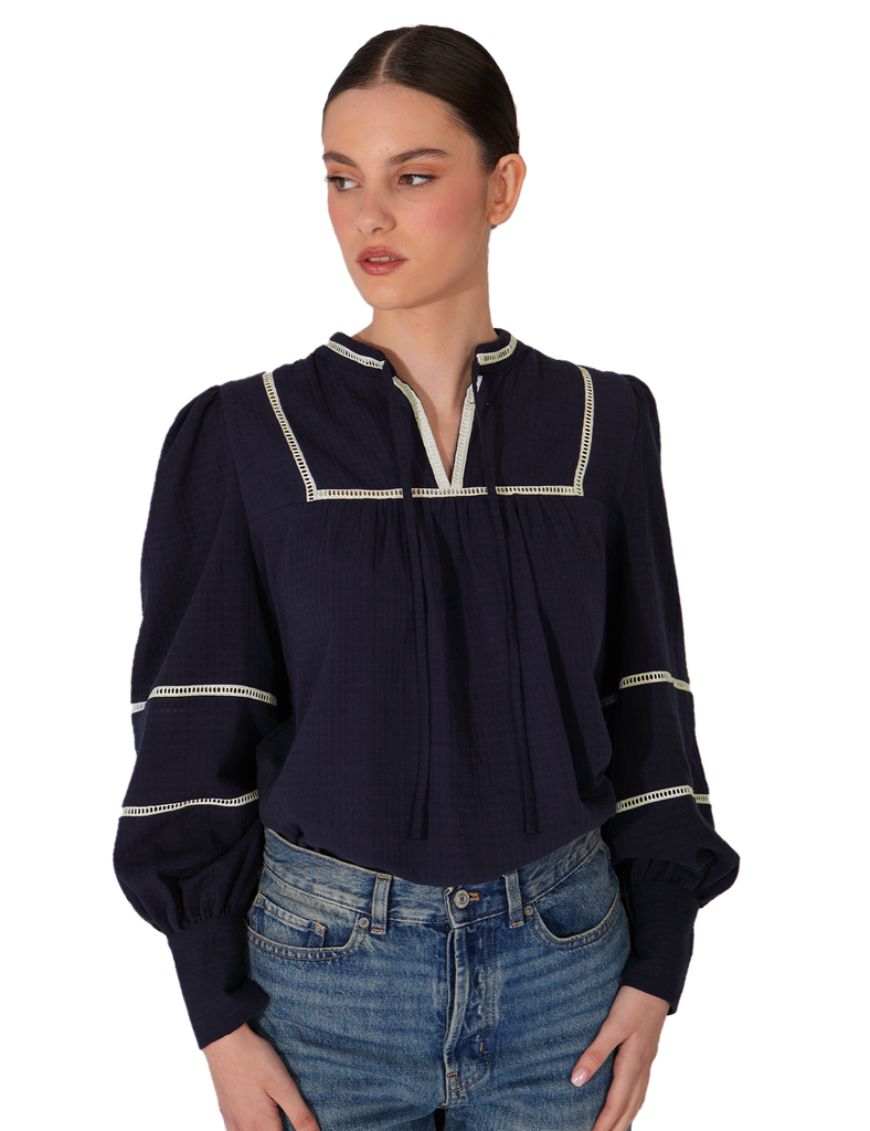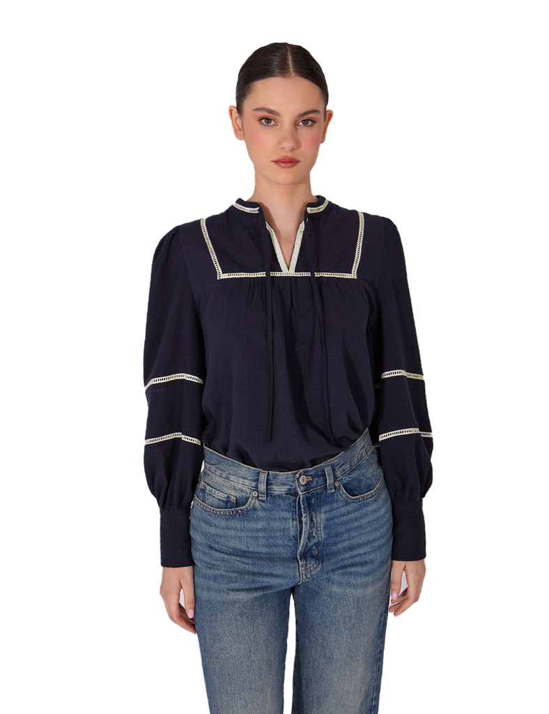 Blusa de silueta holgada 100% algodón en color navy blue con entredós beige a contraste. Escote con abertura y lazada, que permite llevarla tanto abierta como cerrada. Mangas con frunces en hombros, juego de entredós, y puño alto con botones a contraste.