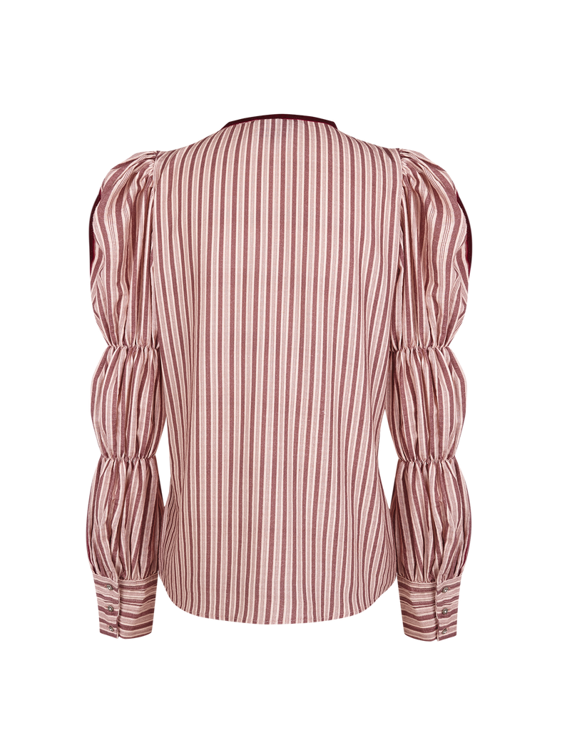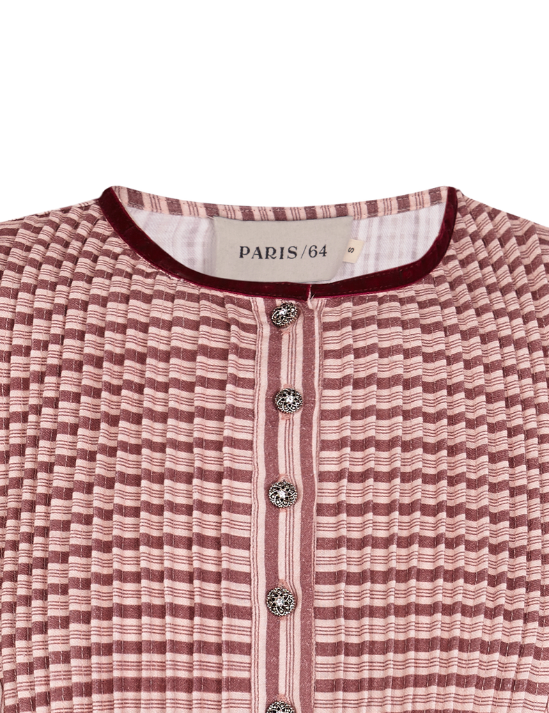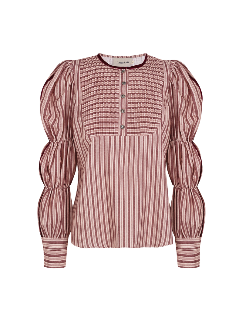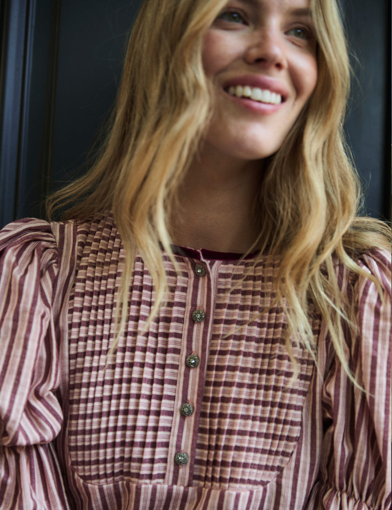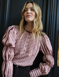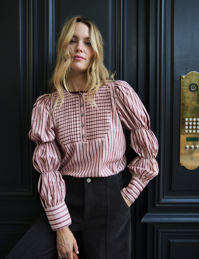 Marguerite, una blusa estructurada que juega de forma sutil con texturas y volúmenes. Su tejido 100% algodón de rayas rosas y magentas otorga ese toque distinguido y la convierte en ese fondo de armario infalible. Delantero realzado con una pechera adornada por finas jaretas verticales y delicados botones joya que también decoran los puños. Mangas abullonadas y cuello redondeado rematados con un ribete oscuro a contraste.