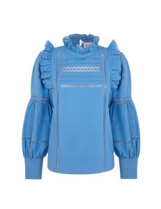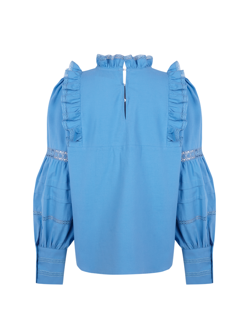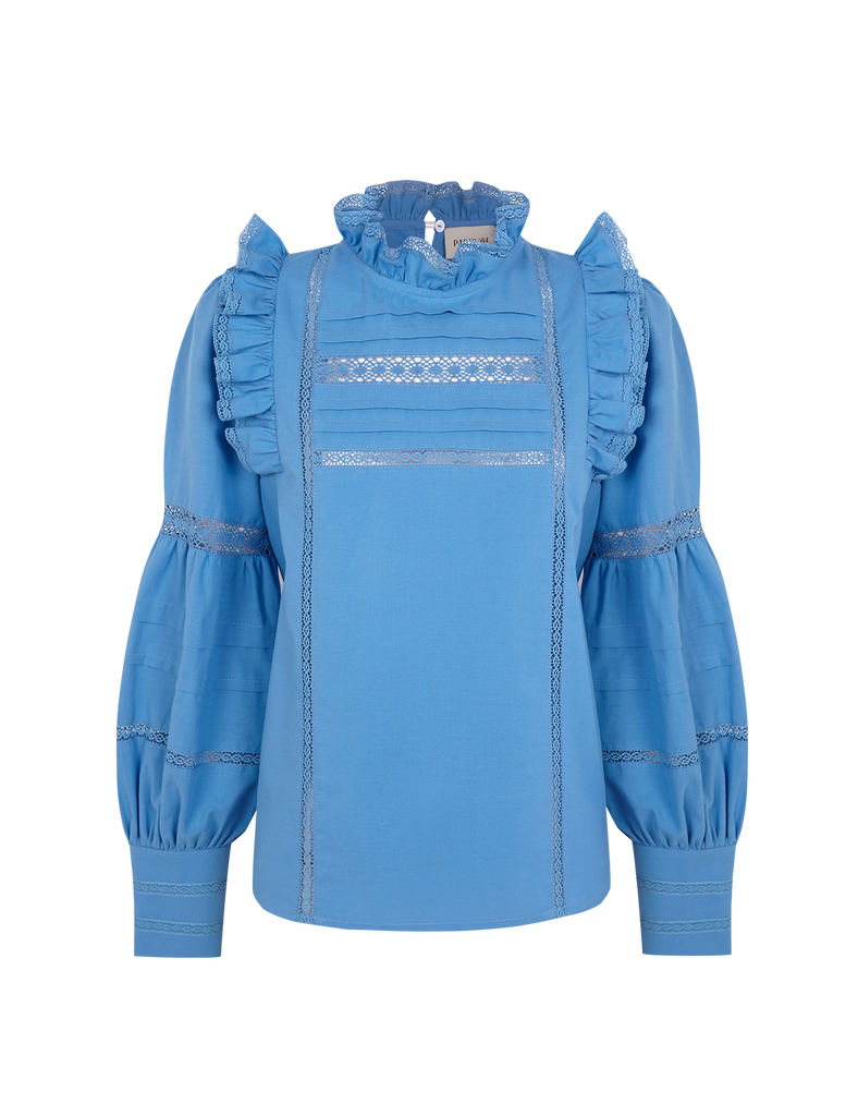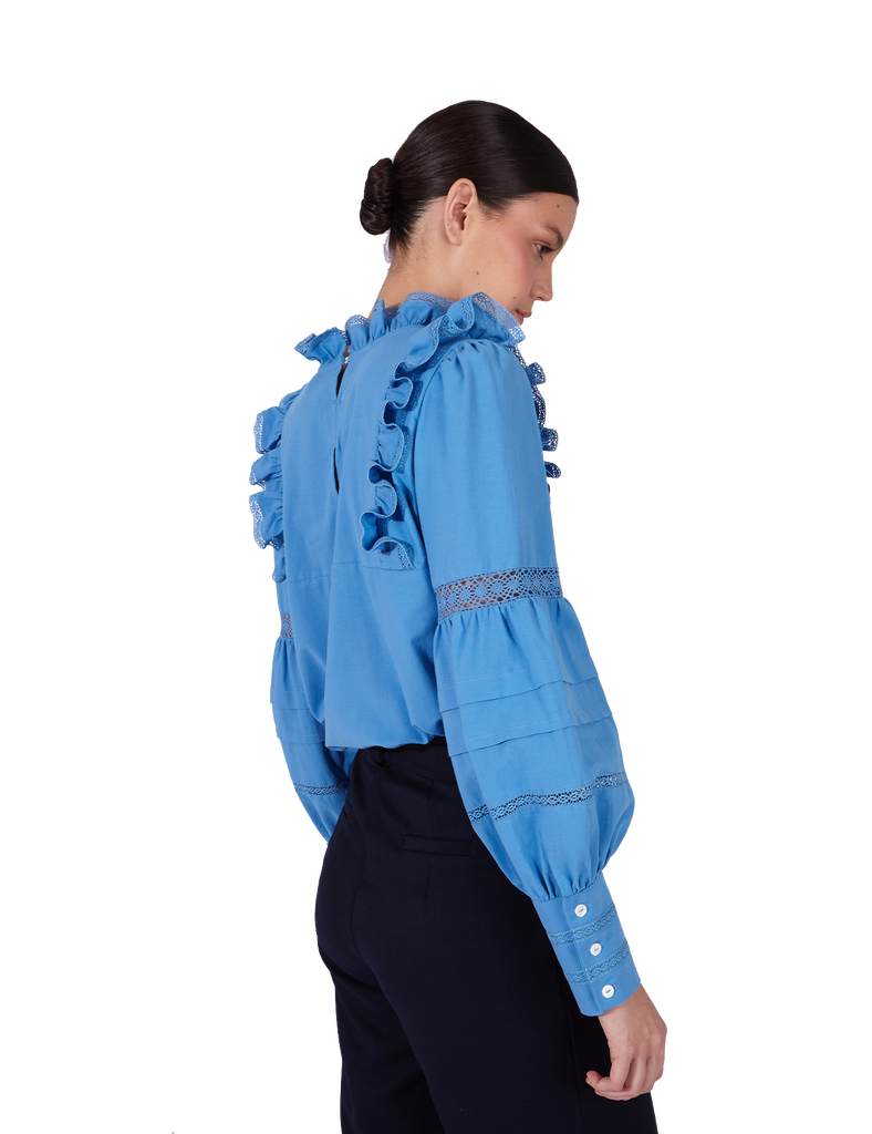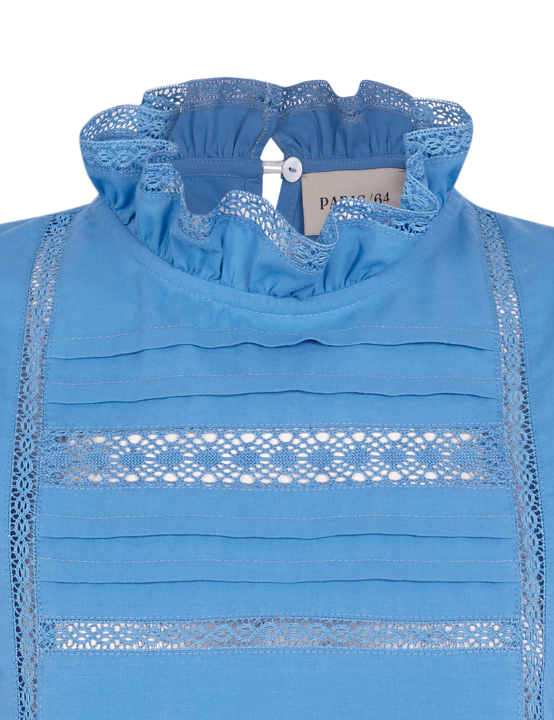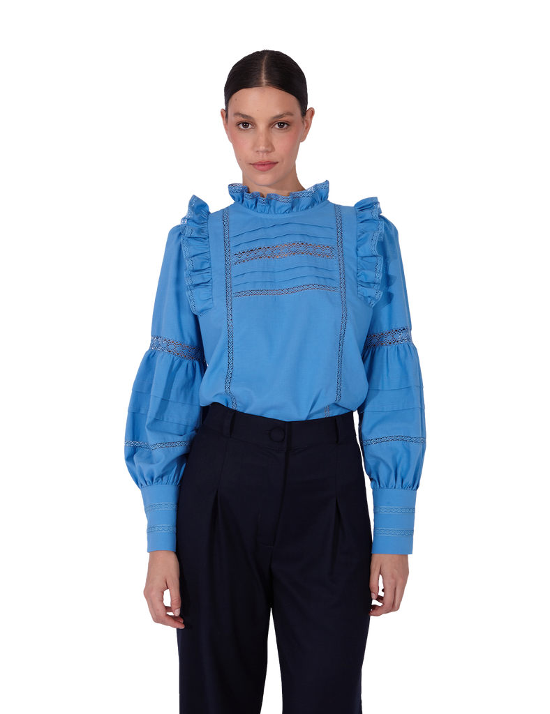 Martina, una blusa azul 100% algodón de inspiración romántica. Tejido de popelín combinado con encaje guipur y jaretas horizontales, que dibujan el pecho y decora las mangas abullonadas.