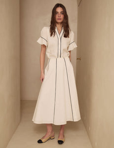 Falda midi confeccionada en una delicada mezcla de lino y viscosa en color crema. Finos vivos a contraste que recorren los cortes verticales. Con un corte evasé que favorece la silueta, incluye un forro interior en voile 100% algodón para mayor comodidad. El cierre lateral mediante cremallera invisible y la ausencia de cinturilla crean un acabado limpio y elegante.
