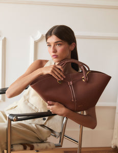 巧克力色牛皮手袋,配有抽绳和磁铁封口以及长皮质手柄,可用作单肩包或手提包。