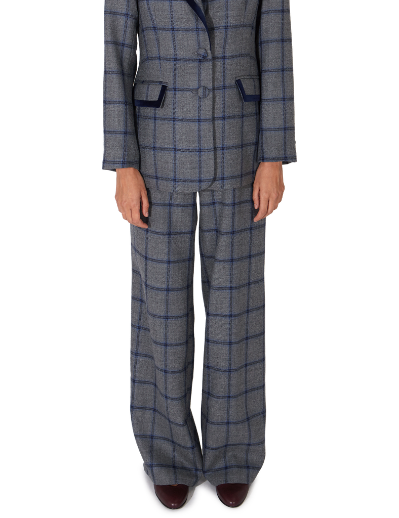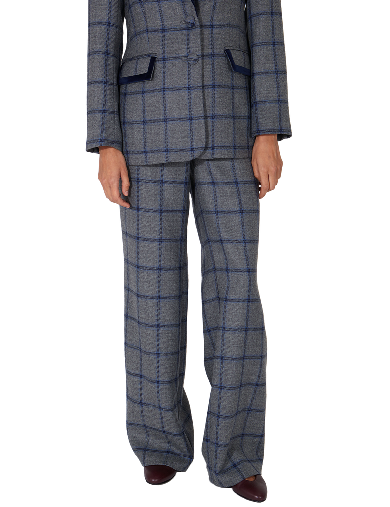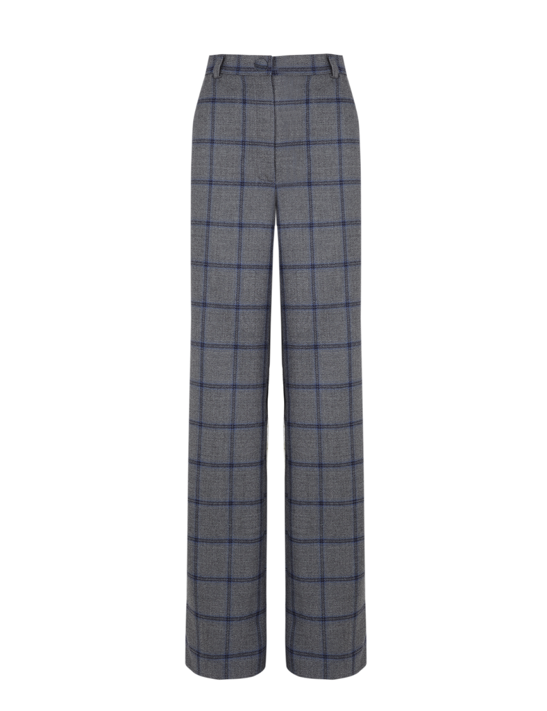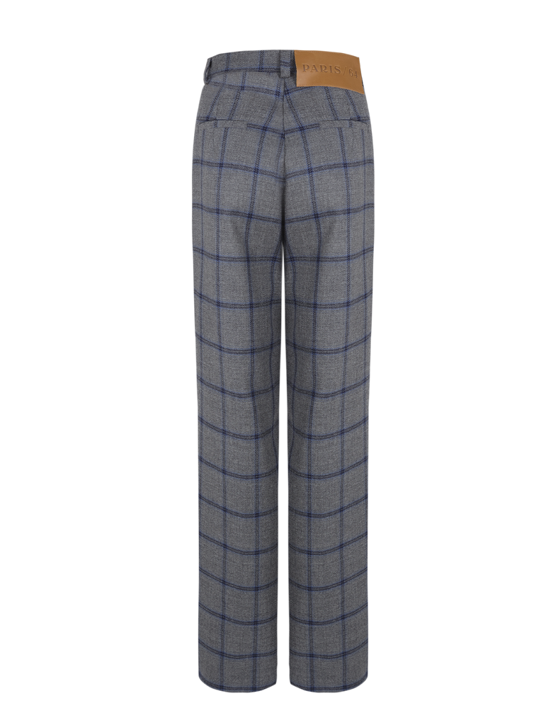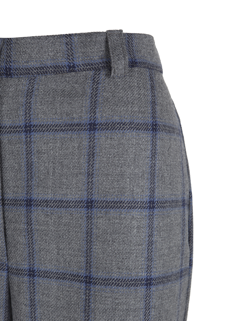 直筒剪裁长裤,采用优质羊毛和羊绒面料。设计采用灰色和海军蓝格纹编织,提升了服装的精致美感。面料的飘逸垂坠感和内衬让穿着更加舒适。